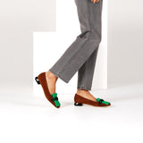 The habbot ‘itaca’ women’s loafer in cocoa brown suede is designed for smart-casual work or off-duty dressing. With a square toe, contrast teal green leather ‘kiltie’ fringe and black metallic accessory, this versatile slip-on flat is comfortable, fun and effortlessly stylish
