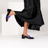 habbot ‘visio’ women’s flat slip-on black patent leather loafers are finished with a flattering high cut vamp in pink calf leather. The addition of metallic blue penny loafer strap detailing and a textured, low block heel rounds out visio's refined trans-seasonal aesthetic