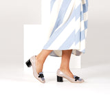 Habbot ‘galvani’ women’s patent leather pumps are perfect for those looking for a head turning heel that delivers on both style and comfort. This sophisticated court shoe is finished in beige patent with an ice blue metallic leather ‘kiltie’ fringe, mid height black block heel and black buckle detail