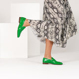 habbot ‘piano’ women’s flat slip-on loafers feature a flattering high cut vamp, with classic penny loafer strap detailing. Soft and supple in textured green patent leather and finished with a low block heel, piano is equally at home paired with tailored workwear or for a casual weekend