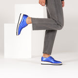 The habbot ‘bolano’ is the ultimate smart-casual women’s lace-up. Crafted from blue metallic leather, bolano has the aesthetic of a classic almond toe flat, combined with the lightness and comfort of a cushioned platform white and black layered microsole