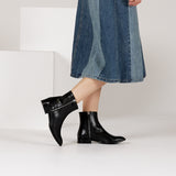 The habbot ‘inoto’ women’s flat ankle boot in supple black calf leather is designed for style, versatility and all-day comfort. With a subtle chisel toe, the ‘inoto’s’ otherwise unadorned profile features a silver zip closure at the instep and a practical low block heel