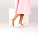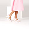 habbot 'elba' women's heels in silver flecked blush pink textile features an elegant enclosed toe with flattering double ankle straps and a supportive mid height block heel. Pair this heel for events with a patterned dress or cropped trousers for a bold style statement