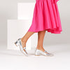 habbot ‘ferrara’ women’s heels offer effortless style. This generous block heeled slip-on in 'argento' silver crinkle metallic leather features a chiseled toebox. Ferrara's refined simplicity is accentuated by its venetian loafer vamp and adjustable strap that buckles across the top of the foot