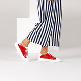 habbot introduces 'calota' to our capsule collection of women's signature Italian made sneakers. Crafted with uppers of white calf leather with red crinkle patent side panels, these stylish trainers sit upon a lightweight white platform rubber sole