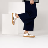 habbot 'lotola' women's Italian made sneakers are crafted with paneled uppers in full grain white calf leather with beige suede trim. Finished with pale gold 'criss-cross' leather detailing, these stylish trainers sit upon a chunky yet lightweight gum coloured rubber sole