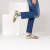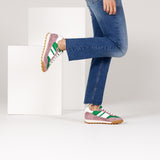 habbot 'minka' mushroom joins our capsule collection of women's signature Italian made sneakers. Crafted with paneled uppers in green and soft lilac purple suede with white crinkle finish calf leather detailing, these stylish trainers are finished with white laces and cream coloured rubber soles