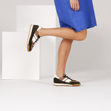 habbot 'minka' olive joins our capsule collection of women's signature Italian made sneakers. Crafted with paneled uppers in coffee brown and olive green suede with white crinkle finish calf leather detailing, these stylish trainers are finished with white laces and cream coloured rubber soles
