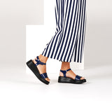 habbot ‘trevi’ women's platform sandals add a fun pop of colour to your casual summer look. With a wide upper in navy blue patent leather, the trevi offers generous foot coverage. The cushioned black leather covered rubber sole offers additional lightweight comfort, making every wear a special event