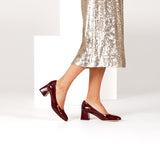 habbot ‘barkly’ women’s leather pumps in deep 'bordo' red crinkle patent leather combine timeless style with everyday comfort. Generous in the width, this flattering high-cut court shoe is finished with a flared mid-height block heel to give this classic footwear style a clean and contemporary edge