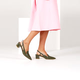 habbot ‘frati’ women’s sling-back heels in olive green patent are a timeless Summer footwear style. With an enclosed point toe, low block heel and adjustable sling-back strap, these deceivingly generous fitting sandals will lift any day or evening look