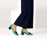 habbot ‘galvani’ women’s pumps offer a head turning heel that delivers on both style and comfort. This sophisticated court shoe in emerald green Italian glitter, is leather lined and finished with a blue glitter bonded ‘kiltie’ fringe, block patent covered block heel and black metallic accessory