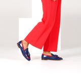 habbot women’s loafers in blue patent, offer a fresh new option to our popular range of slip-on flats. Featuring a rounded toe-box and flattering high cut vamp, viva is finished with a 'kilte' fringe, tassels and red trim detailing