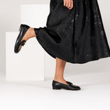 habbot ‘corta’ women’s loafers are designed specifically for those requiring more width in their shoes. These accommodating slip-on flats are constructed from soft black calf leather with a square toe and low block heel. Corta is finished with a bronze metallic leather ‘kiltie’ fringe and black metallic accessory
