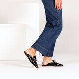 habbot ‘lecco’ women’s slides personify effortless summer style. Our elegant low profile slip-on flats in supple textured black patent leather are versatile, fashion-forward with the addition of a square toe, punch-hole broguing and gold chain detail