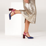 The habbot ‘custo’ women’s high heel sandal features an enclosed navy blue full grain calf leather toebox and adjustable ankle strap in pink metallic leather. A burgundy patent covered block heel further highlights custo’s flattering cut and fun colourway, making every wear a special event