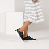 The habbot women's 'wala' sneaker is crafted from smooth, nero black calf leather for a fresh take on the classic lace-up tennis shoe. Perfect for off-duty dressing, wala is finished with a glitter heel counter and an ultra comfortable rubber basket sole in contrasting silver rubber