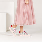 habbot 'wala' women's spot sneakers are crafted from a combination of black on white polka-dot print 'pony' cowhide and suede leathers. Constructed on a generous 'C' width last, this stylish lace-up trainer is finished with a metallic red heel tab, pink rubber sole and removable cushioned insole