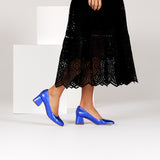 habbot ‘barkly’ women’s leather pumps in cobalt blue metallic leather combine timeless style with all-day comfort. Generous in the width, this flattering high-cut court shoe is finished with a flared mid-height block heel to give this classic footwear style a clean and contemporary edge