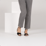 Celebrate every day in the habbot ‘pepe’ heeled sandal. Finished in soft black suede with gold glitter accents at the ankle strap and heel, pepe is the perfect shoe for any event. With flattering cross straps to snugly hold you in place, this block heel is the perfect blend of elegance and comfort