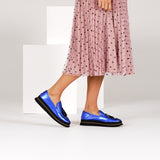 habbot ‘harola’ women’s cobalt blue metallic leather loafers are a fun and functional slip-on style. This smart-casual chunky loafer feature a black leather tassel, spongy black platform sole and removable insole, designed to fit both the average wearer, or those who wish to accommodate an orthotic