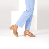 habbot women's 'borgo' heeled loafers in 'mocha' brown crinkle patent leather will elevate any corporate or evening look. These stylish monochrome slip-ons feature a square toe-box outlined by two lines of decorative stitching, a stylish flared block heel and 'kilte' fringe and tassel detail
