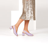 habbot ‘brolo’ women’s sling-back heels in purple nappa leather are a timeless summer style. With a tapered peep-toe, high topline edge to comfortably enclose the foot, and elasticated sling-back strap, these flattering lilac block heels are perfect for those needing additional width in their shoes